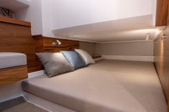 Die flexible Anordnung der hinteren Sitze die wahlweise als Lounge, als Essbereich für mehrere Personen oder als Sonnenliege genutzt werden kann, Pantry an Deck in direkter Reichweite des Tisches, Stabilisierungssysteme, XXL Staumöglichkeiten für Wasserspielzeug und Equipment, großes ebenes Deck ohne Stolperfallen und genug Sonnenliegen für alle an Bord. Das alles in zeitlosem skandinavischen Design.