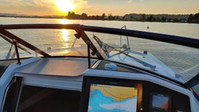 Die schlanke Windschutzscheibe, die sich an den Seiten fortsetzt, bietet im gesamten Cockpit einen erheblichen Schutz vor dem Fahrtwind. Um das Fahren noch komfortabler zu gestalten, verfügt das Boot standardmäßig über eine hydraulische Lenkung und einen 9 Zoll Kartenplotter. Alle Armaturen, Schalter und der Kartenplotter befinden sich gut im Blickfeld des Fahrers. Eine Bugleiter erleichtert das einsteigen über den Bug. Es gibt auch einen Platz für Bugstrahlruder und Scheinwerfer. Der sehr starke LED-Scheinwerfer macht die Nacht zum Tage beim anlegen im Hafen. Die grosszügige U-Bank im Heck bietet Platz für bis zu sechs Personen. Die Heckfahrpersenning mit Tisch und Sonnenliege verwandelt die Rückseite des Bootes in einen zweiten Schlafplatz.